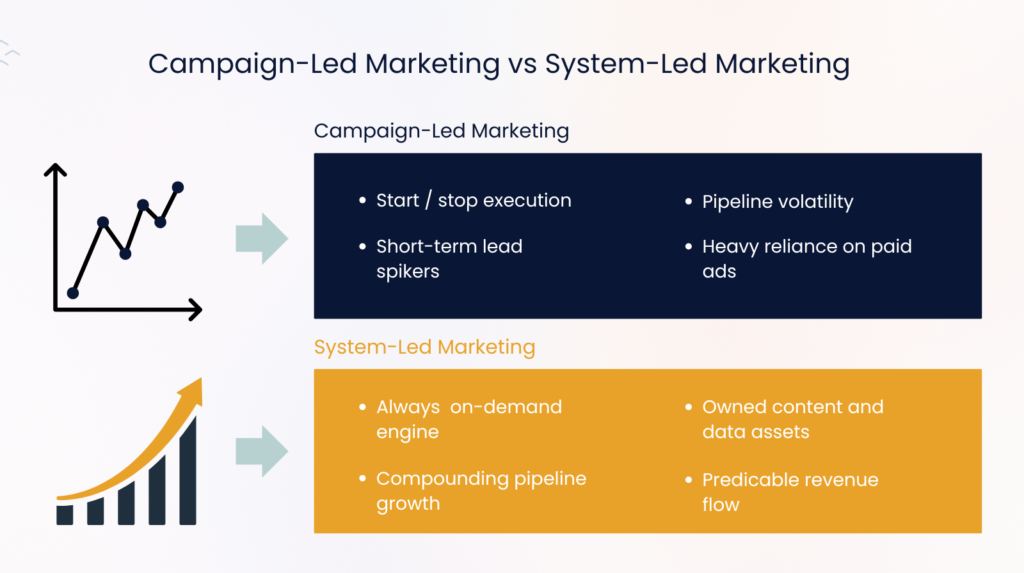 The best CMOs and Demand Gen leaders in 2026 no longer take this reactive stance. They’re creating B2B marketing systems, not just running campaigns. They understand that sustainable growth comes from systems that generate demand continuously, not from sporadic campaigns.