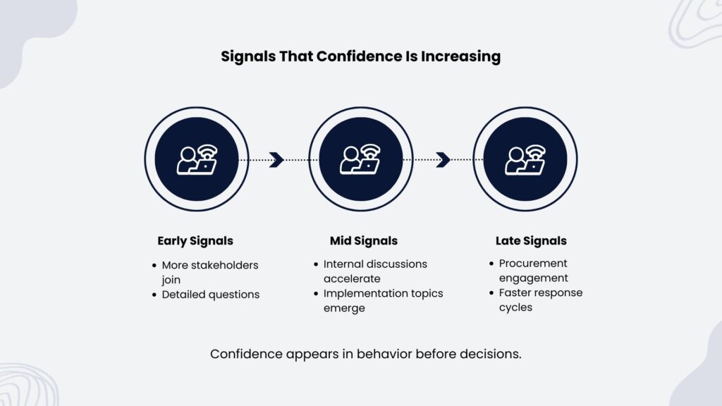 Confident purchases exhibit rapid stakeholder convergence. Confident buyers bring others into the conversation willingly. When a prospect quickly introduces you to the economic buyer or implementation team, they’re advocating for you internally.
