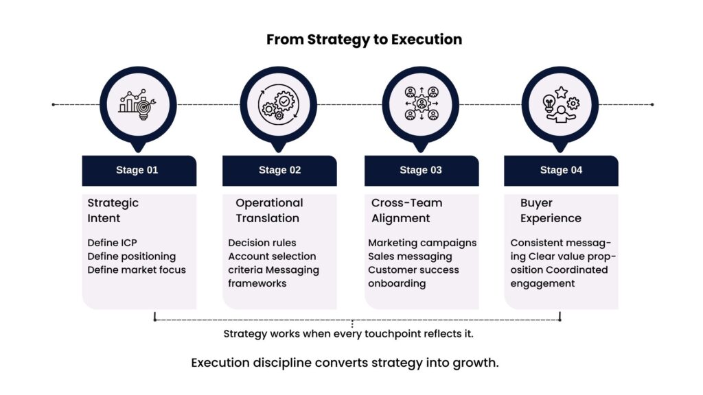 The most common translation failure: strategies articulated at altitudes execution teams cannot operationalize. Leadership defines “focus on mid-market technology companies experiencing rapid growth” as the ICP. But what does that mean for an SDR qualifying an inbound lead?