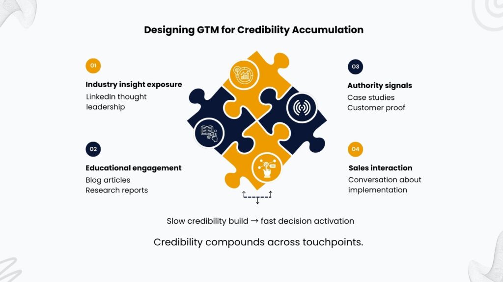 Establishing credibility takes time through a series of campaigns; it builds cumulatively over time through various interactions. The goal is to design a GTM motion built for B2B credibility building, one that feeds this accumulation rather than interrupting it.
