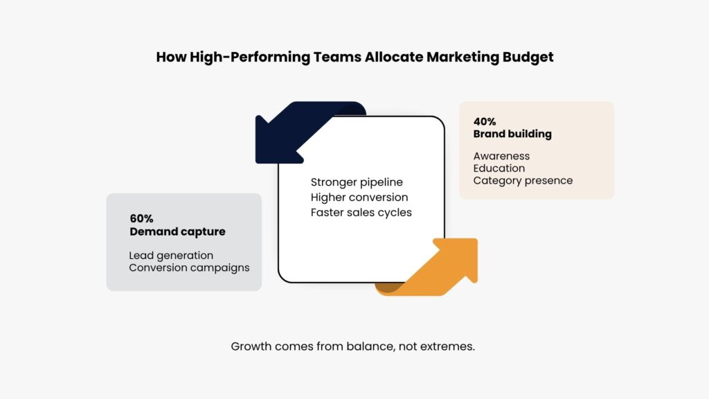 Research on integrated marketing approaches reveals organizations achieving superior performance typically allocate 40% to 60% of marketing resources toward brand building with returns measured over quarters and years. The remaining 40% to 60% focuses on demand capture with returns measured over weeks and months.
