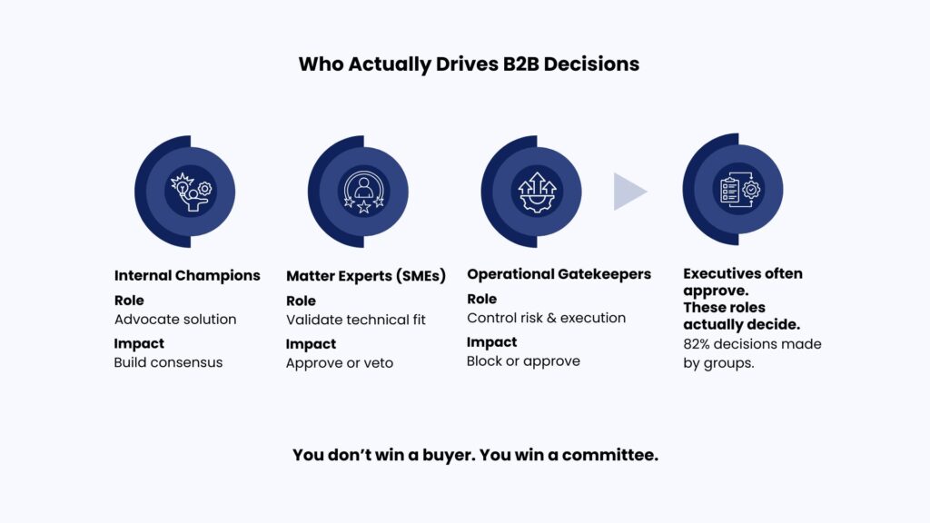 82% of B2B buying decisions are now made by groups rather than individuals. Those groups include champions, SMEs, and gatekeepers whose influence far exceeds their titles.