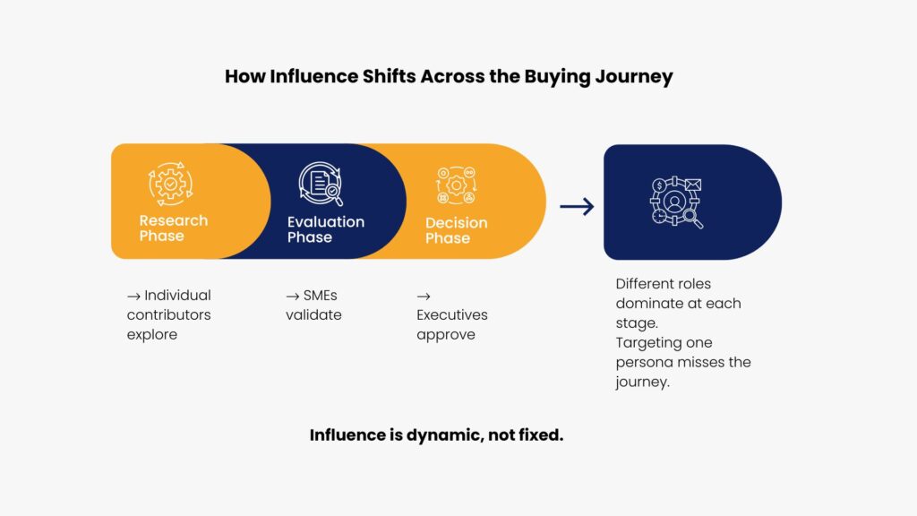 Influence also shifts throughout the buying journey. Early research phases involve individual contributors exploring solutions independently. Mid-stage evaluations bring in SMEs for validation. Final approvals require executive buy-in. Targeting the same title at every stage means reaching the wrong person at the wrong time.
