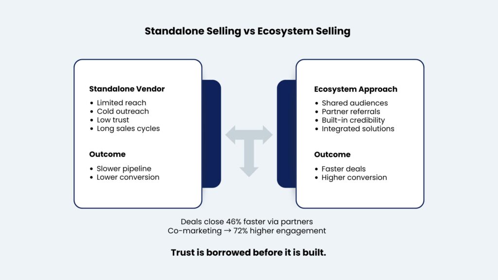 Partner-sourced deals close 46% faster than cold outreach, according to Crossbeam research. Trust has already been established before your sales team enters the conversation. When a buyer trusts one vendor in an ecosystem, that trust extends to its partners. 94% of B2B marketers agree trust is key to success, and buyers trust ecosystem recommendations far more than vendor claims.