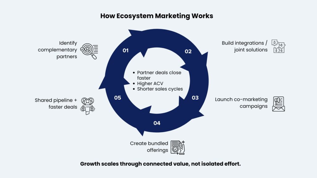 Stronger competitive positioning: Ecosystem participation creates switching costs that standalone product quality cannot generate. Buyers invested in ecosystem configurations face substantial friction replacing individual vendors. Early ecosystem participants establish integration depth and partner relationships that later entrants struggle to replicate. A global technology company that made ecosystem marketing strategy, the core of its GTM strategy, sustained a 28% CAGR over four years against an industry average of 12%.